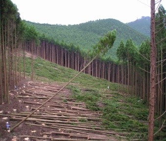 最低でも樹齢50年以上(基本は樹齢60年以上)。他の木を傷めないように、正確に方向を決めて倒す。